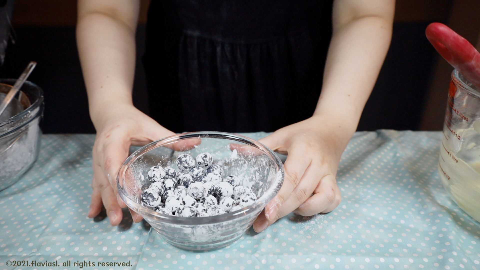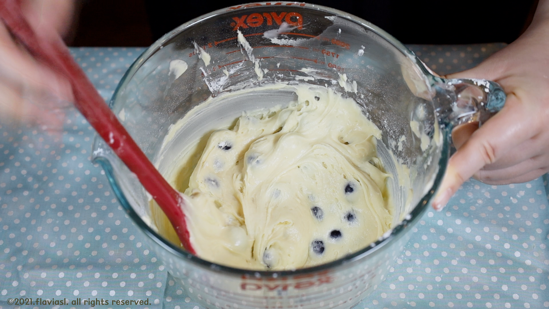 아까 남겨두었던 밀가루로 블루베리를 코팅한 뒤 반죽에 섞어주면